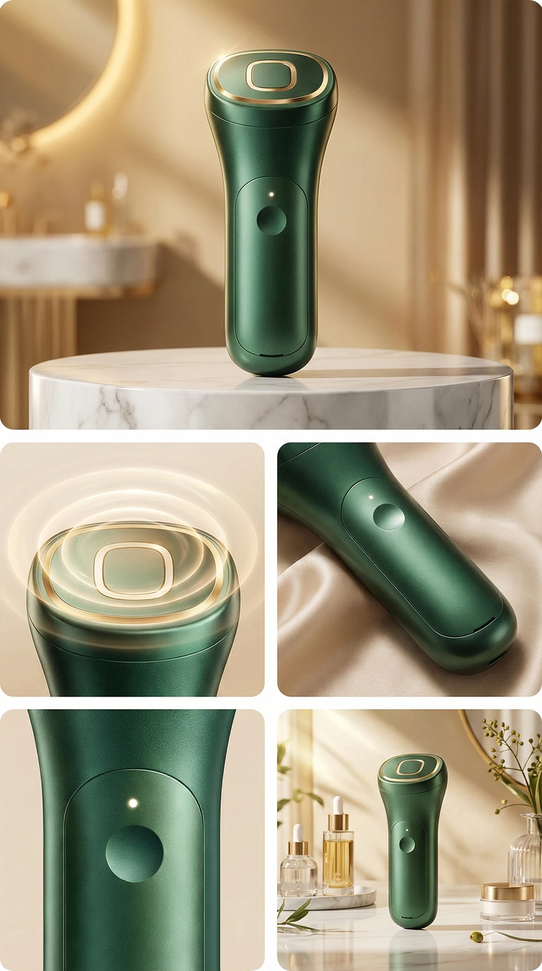 Designed as a handheld device that blends seamlessly into daily routines, VERDE features a minimalist single-button interface and a stable, ergonomic grip. The green pearl coating and gold trim elevate its premium impression, while the refined, planar geometry of the top head section reinforces a clean, tech-forward mood. From an ODM perspective, this product can be proposed as a full development package including exterior design and CMF (Color, Material & Finish) guidelines, manufacturing feasibility reviews for mass production (injection molding, coating/painting, and assembly), and a structured QC checkpoint plan.